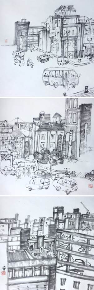 创作说明:根据自己的感受对考察期间搜集的资料素材进行了再次整理,分析建筑的造型并尝试找到具有个性的表现手法。画面中的形象均加以概括,分别以不同的墨法,利用生宣纸特有的渗化效果,留意这个过程中出现的偶然性效果,尝试表现方法的多种可能性,进行了一系列水墨表现语言与城市建筑造型变化方面的创作。