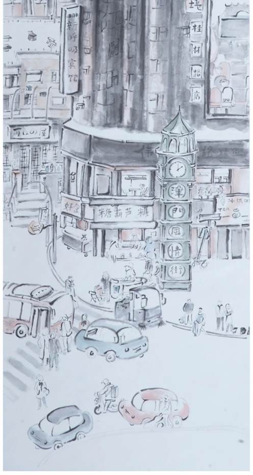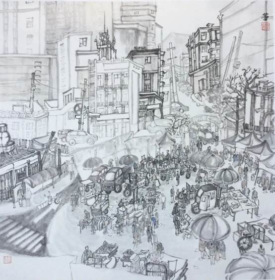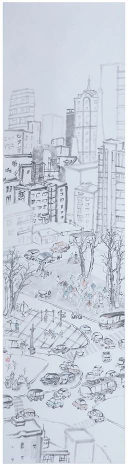 创作说明:构图上借鉴了传统山水画散点透视的方法,来铺陈出城市老街区的整个场景,并综合运用“深远法”与“高远法”,结合起来表现出老街和新城之间的空间跨度,然后将人物“点缀”其间,以此来表现老街区的生活气息。在交通工具的造型上,我以类似于卡通的形式进行塑造,使画面增添另一番趣味,体现我自己对于都市的另一种情感。