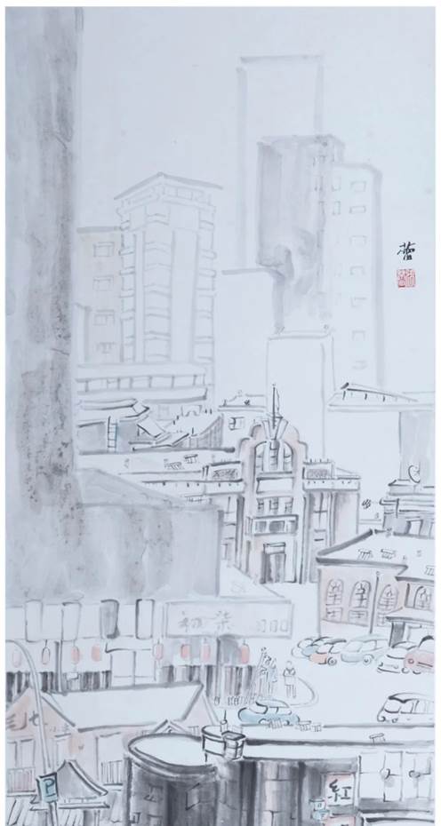 创作说明:桂林路是长春比较有辨识度的历史街区,所以我选择用明亮的色彩来表现交通工具以及广告牌,来突出桂林路的特点,表现出大都市老街区深藏的五彩缤纷的生活情味。为了更好体现东北城市的特点,我选择用雪景来衬托这个主题,采用了淡墨大面积渲染的方式来表现初雪过后街区宁静祥和的氛围,使观者感受到雪中漫步的意境。