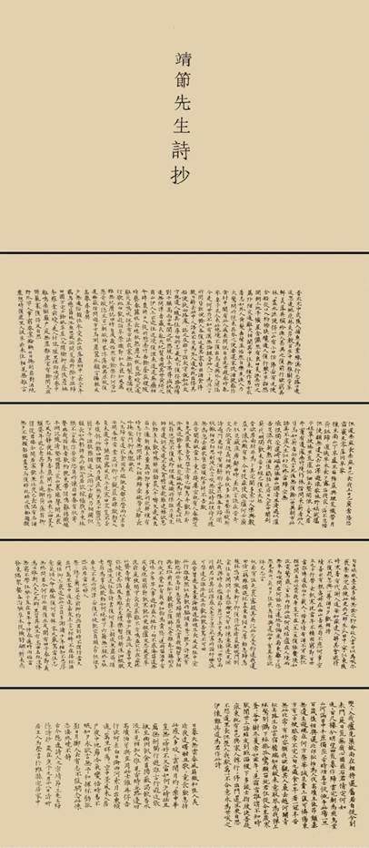创作说明:《靖节先生诗抄》整幅用长形纸拼接而成,使整幅作品既有疏密,又能首尾呼应。纸张上选择蜡染纸,此纸能很好地表现出用笔细节且与古雅的小楷风格相统一。内容为陶潜诗文,此类内容正与我的小楷书风相契合,可以使文意和书风互相生发。用笔仍停留在技法层面,距离入古出新写出自我的阶段尚远。