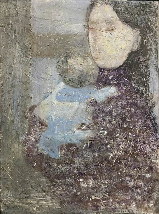创作说明:画面中母亲神态安详平和,怀抱中的婴儿形象较灵活生动,根据自己的构思和自己独特的形式语言进行的创作。